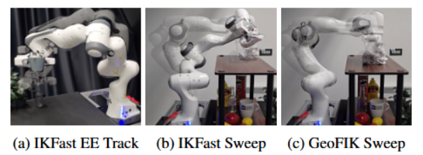 研究将GeoFIK与HeLiu、IKFast、IKGeo三类主流求解器进行对比,覆盖计算效率、解有效性、奇异位形表现与实体部署效果。