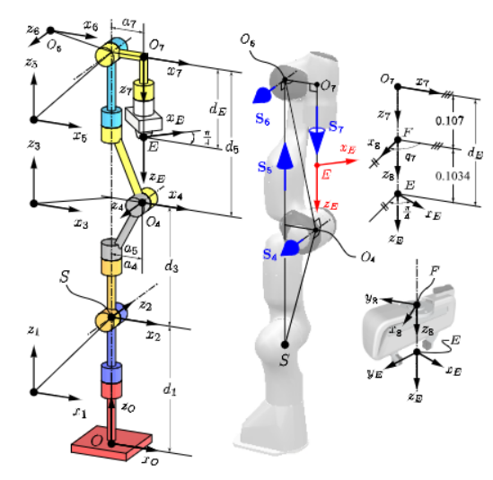 图1:Franka 机械臂在各关节角 qi=0(i=1,…,7) 时的初始构型,以及末端执行器坐标系的细节。注:坐标系 8 与坐标系 E 均刚性固连在夹持器上。
