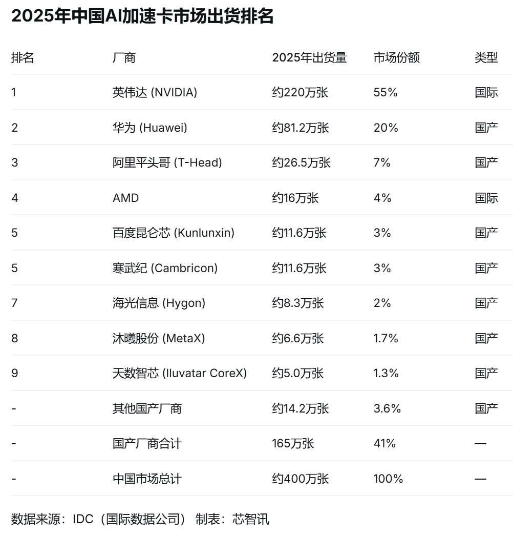 IDC的数据显示,中国本土的GPU和AI芯片厂商在2025年向本土的AI服务器市场交付了165万张AI加速卡,在总出货量400万张加速卡当中的占比超41%(通常情况下一张AI加速卡上是配备一颗AI芯片)。相比之下,基于英伟达GPU的AI加速卡在中国市场的出货量预计约220万张卡,市场份额约55%。这与英伟达的H20 AI加速卡被美国实施出口管制之前所宣称的在中国市场占据的95%份额下滑了近一半。并且,在新的AI加速卡恢复对华销售之前,英伟达在中国市场的份额预计将会进一步降低。