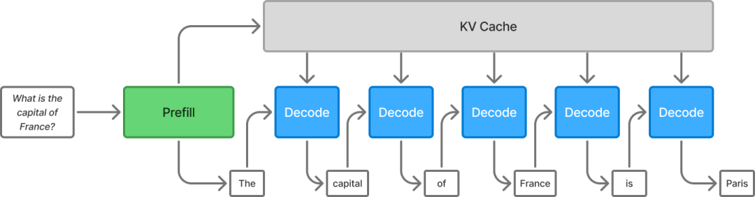 预填充 (计算密集型) 和解码(内存密集型)是大模型推理的两个主要阶段。在预填充阶段,输入提示被处理并生成第一个token。随后进入解码阶段,一次生成一个token,直至所有token生成完毕。