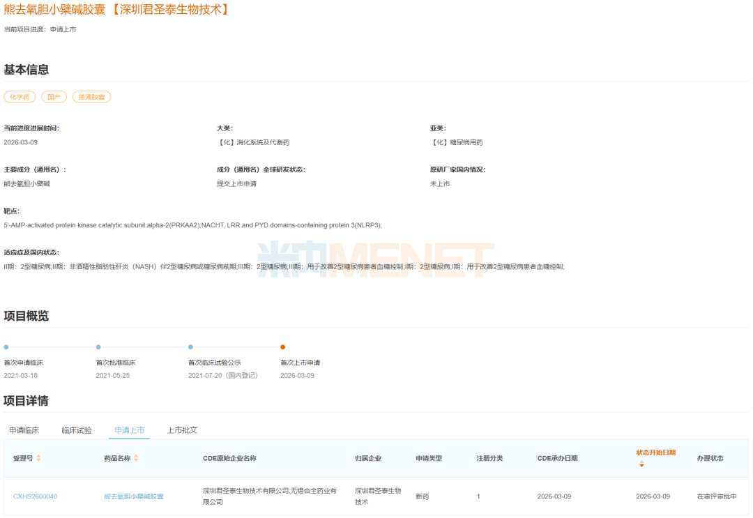 在刚过去的3月,南通联亚药业的利格列汀二甲双胍缓释片、烟台鲁银药业的达格列净二甲双胍缓释片(Ⅰ)、安徽万邦医药科技的氢溴酸替格列汀片等多个糖尿病用药报产获CDE受理。其中,江苏恒瑞医药的舒地胰岛素诺利糖肽注射液、深圳君圣泰生物的熊去氧胆小檗碱胶囊2个为1类新药,而深圳君圣泰生物的熊去氧胆小檗碱胶囊则是公司提交的首个新药上市申请。