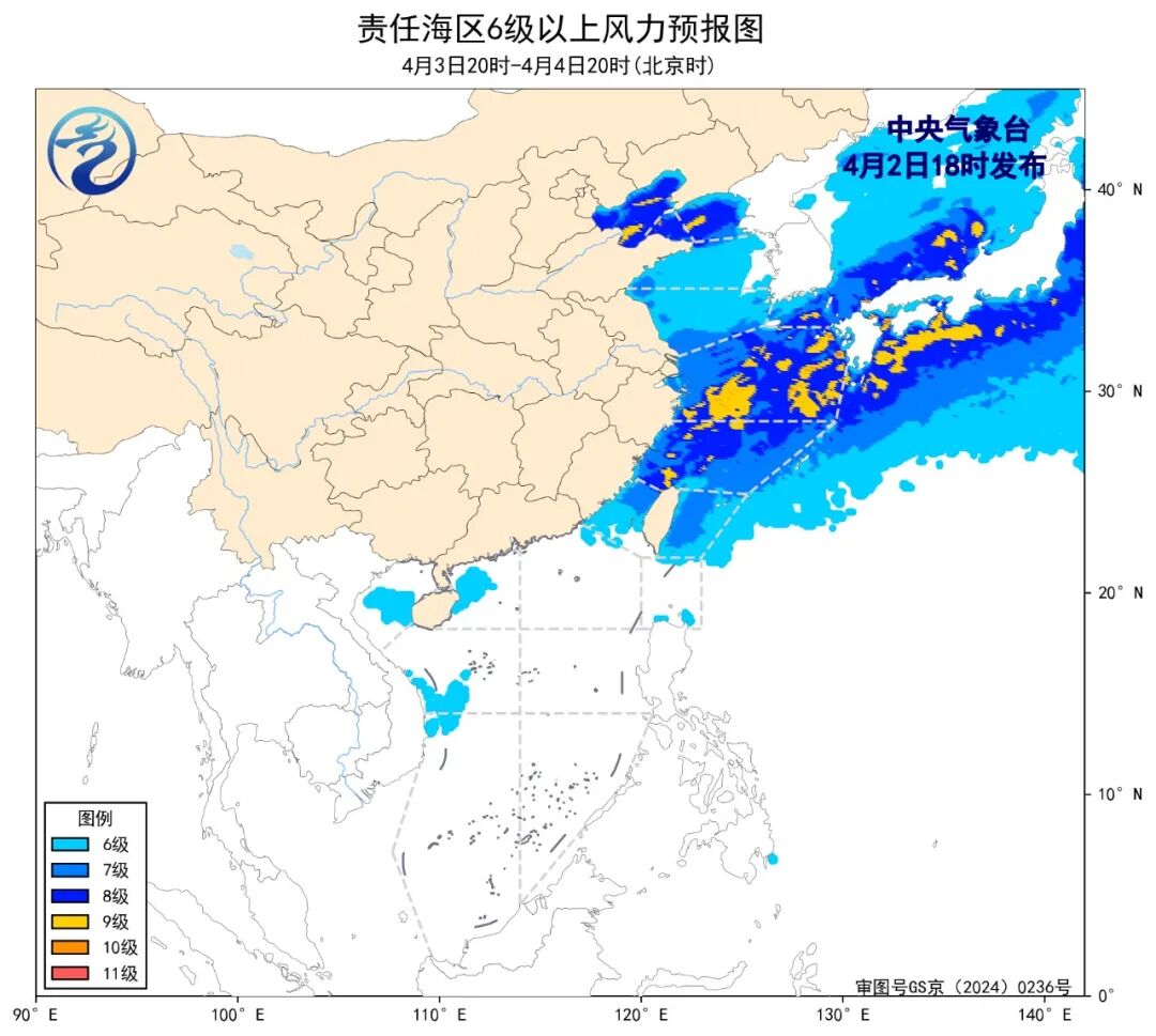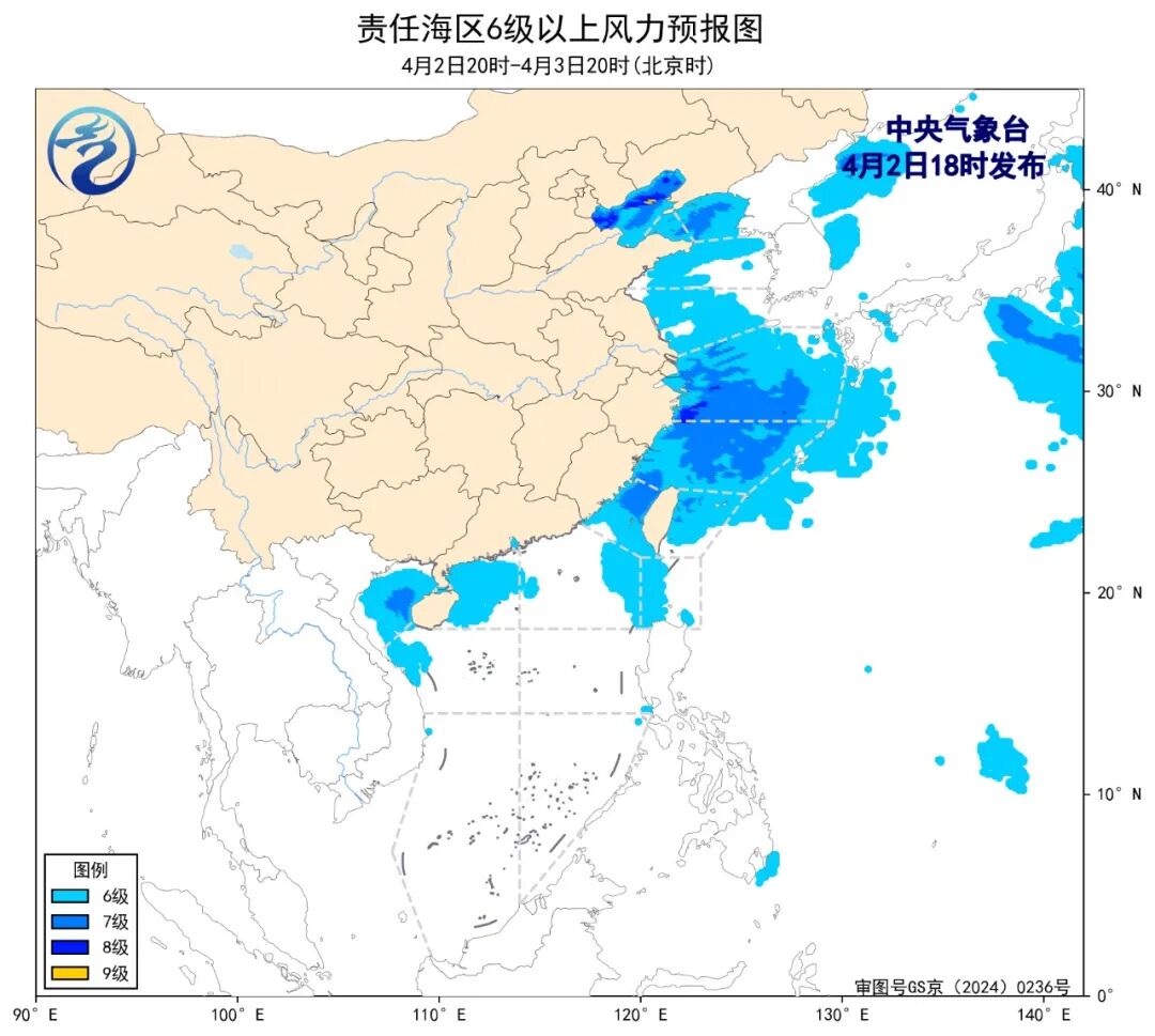 预计,4月5日夜间至9日白天,渤海、黄海大部海域、北部湾、南海大部海域将有6~7级、阵风8级的风,渤海海峡、巴士海峡、琼州海峡将有5~6级、阵风7级的风,东海大部海域、台湾海峡、台湾以东洋面将有7~8级、阵风9级的大风。