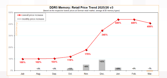 国际市场的DDR5也出现了小幅回调。来自硬件价格监测机构3DCenter的最新数据显示,2026年3月,德国市场DDR5内存零售均价环比下跌7.2%,价格指数从2025年7月为基准的440%回落至408%,为连续8个月上涨后的首次月度下跌。
