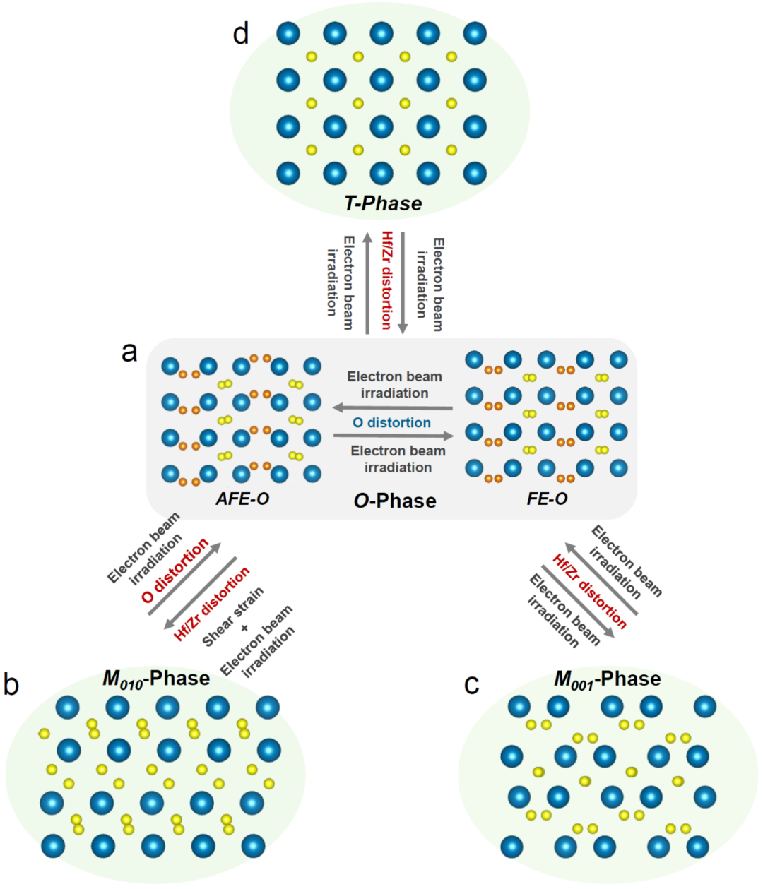 基于二元HfO₂的铁电材料因与CMOS工艺兼容且具备纳米尺度的强铁电性而备受关注,但其铁电相(亚稳正交相)在常温常压下极不稳定,易转变为单斜或四方相,导致薄膜多为多晶多相结构,严重制约了器件的稳定性与性能。因此,阐明铪基薄膜中的复杂相变行为并揭示其相变机制,对实现铁电相的稳定设计至关重要。然而,现有研究多聚焦于相变过程中阳离子晶格的剪切行为,忽视了决定极化与否的关键阴离子(氧离子)在相变中的作用,导致正交相与单斜相、四方相等相变的结构机制仍存在诸多争议。特别是,目前相关研究分散于多晶薄膜、纳米晶等不同材料体系中,掺杂、界面及比表面积等体系差异使研究结论各不相同,缺乏对相变行为的统一理解。因此,系统揭示HfO₂基薄膜中复杂相变行为及其结构机制,成为稳定亚稳态铁电相、优化器件性能的关键科学问题。