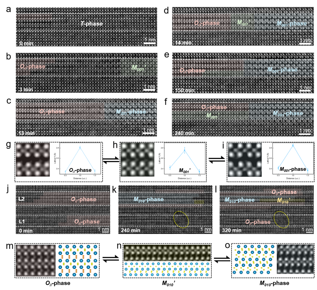 本研究通过构筑简化的模型体系-铪基超晶格单晶薄膜,排除了传统多晶薄膜中复杂界面对相变过程的干扰,并利用像差校正透射电子显微镜开展原位电子束辐照实验,系统研究了铪基薄膜中的多种相变行为,在亚埃尺度逐步揭示了诱导相变的异步亚晶格畸变行为。值得指出的是,初始正交相的极化方向决定了相变发生的方向,即向单斜相还是四方相转变。其中,正交相与不同取向单斜相之间发生相变时,需要不同的激活条件,并产生不同的离子畸变位移行为。与上述相变过程中阳离子、阴离子择优异步畸变行为不同,正交相的极性与反极性变量间的相互转变则仅需氧离子亚晶格的位移畸变,即可诱导极化翻转。该工作系统阐明了铪基材料中结构相变的核心机制,解决了此前存在的诸多争议,为设计高性能铪基电子器件提供了关键结构信息。