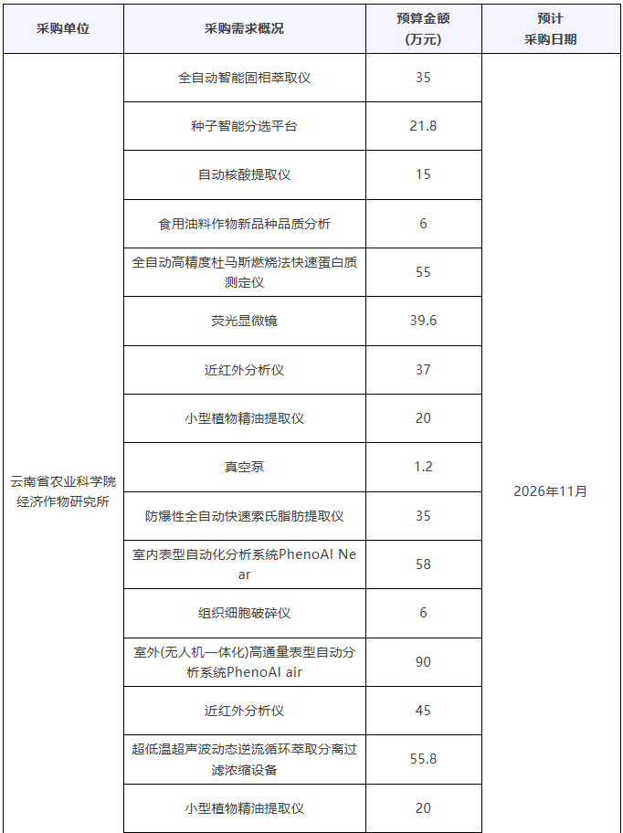 近期,云南省农业科学院多家院属单位发布2026年仪器设备采购意向,计划采购全自动智能固相萃取仪、自动核酸提取仪、荧光显微镜、近红外分析仪、组织细胞破碎仪、紫外分光光度计、高速冷冻离心机、真空冷冻干燥机等仪器设备,预算总金额8921.238万元。预计采购时间2026年2月~11月。 采购意向只是政府采购的初步安排,具体采购情况以各单位发布的采购公告和采购文件为准,有意向的企业可持续关注其发布的招标信息。 云南省农业科学院2026年仪器采购意向汇总