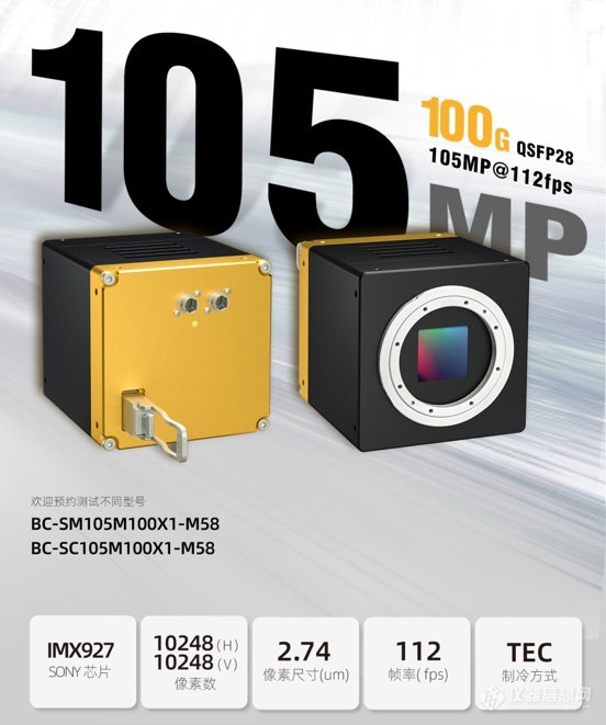 近日,北京博视像元科技有限公司发布全球首款1亿像素高通量CoF(Cable over Fiber)光口相机。该产品专为CoWos(Chip-on-Wafer-on-Substrate)等先进封装工艺的检测需求设计,旨在解决高分辨率成像与海量数据传输的行业痛点。据官方信息,此次发布的相机包含两个型号:BC-SM105M100X1-M58(单色)和BC-SC105M100X1-M58(彩色)。两款产品均搭载索尼IMX927 CMOS传感器,主要技术指标如下:有效像素为1.05亿(10248 × 10248),像素尺寸2.74μm × 2.74μm,最高帧率112fps,制冷方式为TEC半导体制冷。应用场景为Cowos 芯片缺陷检测/CoWos超大芯片3D量测/wafer几何形貌测量。随着AI芯片需求持续增长,CoWos等2.5D/3D封装技术成为高性能计算的主流选择。封装工艺的微细化对检测设备提出更高要求:既需要高分辨率捕捉微米级缺陷,也需要高带宽支持实时数据传输。博视像元此次推出的1亿像素相机,采用100G QSFP28光口传输方案,相比传统接口在带宽上实现数量级提升,可满足高分辨率图像数据在高速检测场景下的传输需求。图源:博视像元