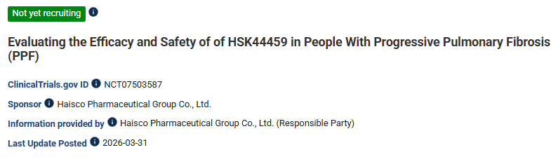 3月31日,美国临床试验收录网站显示,海思科启动了HSK44459的首个III期临床试验。该研究是一项随机、多中心、双盲、安慰剂对照临床试验(n=378),旨在评估HSK44459(每日2次,口服)治疗进行性肺纤维化(PPF)患者的有效性和安全性。研究的主要终点是第52周用力肺活量(FVC)较基线的变化。HSK44459为海思科自主研发的小分子口服PDE4B抑制剂,在临床前研究中显示出显著的抗炎和抗纤维化作用。I期研究显示,HSK44459在健康受试者中单次或连续7天多次给药后安全性和耐受性良好。PDE4B与炎症调节和免疫感受态细胞的调节有关,抑制PDE4B会增加细胞内环磷酸腺苷(cAMP)的水平,影响炎症、免疫应答和纤维化过程,包括减少促炎介质的释放和炎症细胞的募集。肺纤维化小鼠模型显示,PDE4B抑制剂与吡非尼酮和尼达尼布的抗纤维化疗效相当。目前,全球共17个在研选择性PDE4B抑制剂,其中仅5款已开展临床试验。那米司特是目前唯一一款上市的PDE4B抑制剂,于2025年10月先后在中国和美国获批上市。该药物既可用于治疗PPF,也可用于治疗特发性肺纤维化(IPF)。HSK44459紧随其后,是第二款启动III期临床的PDE4B抑制剂。石药集团的SYH2059和人福医药的HW252001处于I期阶段。