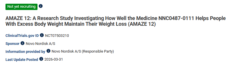 3月31日,美国临床试验收录网站显示,诺和诺德在超重人群中启动了Zenagamtide(Amycretin,NNC0487-0111)的首个III期临床试验(AMAZE 12)。Zenagamtide是一种单分子激动剂,作用于胰高血糖素样肽-1受体(GLP-1R)和胰淀素受体(AMYR),适用于每周1次皮下注射给药和每日1次口服给药。AMAZE 12是一项全球性、多中心临床试验(n=600),旨在评估Zenagamtide(皮下注射,每周1次)对比安慰剂的有效性和安全性。研究的主要终点是第40-92周受试者体重的变分比变化。在I/II期研究(NN9490-7613)中,肥胖或超重受试者接受Zenagamtide治疗36周后,体重降低了24.3%,而安慰剂组仅降低1.1%。在II期研究中,2型糖尿病受试者接受Zenagamtide治疗36周后,HbA1c水平最高降幅达到-1.8%,而安慰剂组降幅为-0.2%,体重最高降幅为14.5%,而安慰剂组降幅为2.6%。